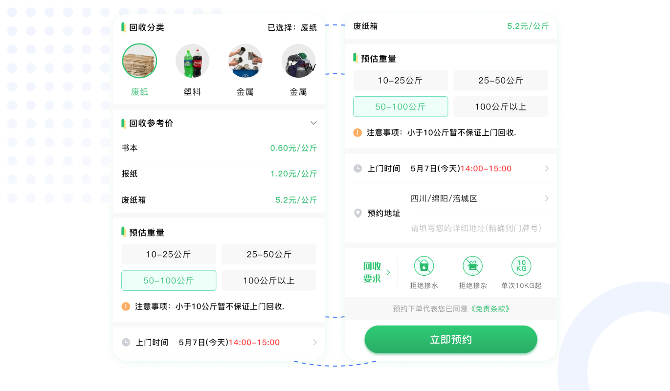 麥芒環保回收解決方案:用戶通過小程序下單、系統自動分單、回收員上門回收、線上結算打款等幫助回收行業互聯網+,實現廢品回收數互聯網轉型,為環保事業做貢獻。
